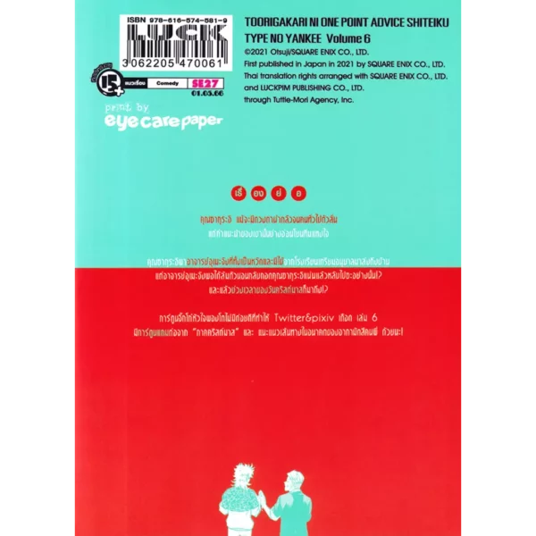 คุณ” ซากุระอิ” แม้จะมีดวงตาน่ากลัวจนคนทั่วไปตัวสั่น แต่คำแนะนำของเขานั้นช่าง อ่อนโยนทิ่มแทงใจ คุณซากุระอิพา “อาจารย์อุเมะจัง” ที่ทั้งเป็นหวัดและมีไข้จากโรงเรียนเตรียมอนุบาลมาส่งถึงบ้าน แต่อาจารย์อุเมะจังพอได้ล้มตัวนอนกลับกอดคุณซากุระอิแน่นแล้วหลับไปซะอย่างนั้น!? และแล้วบางเวลาของวันคริสต์มาสก็มาถึง!? การ์ตูนจิ๊กโก๋หัวใจพองโตไม่มีต่อยตีทำให้ Twitter Pixiv เดือด เล่ม 6 การ์ตูนเกมต่อจาก “ภาคคริสต์มาส” และ แนะแนวเส้นทางในอนาคตของ “อากามัตสึ” คนพี่ด้วยนะ!