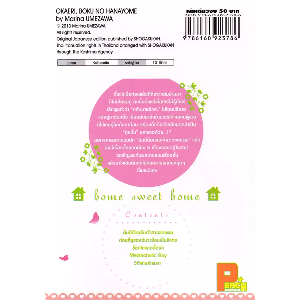 ตั้งแต่เมื่อก่อนแล้วที่ถึงจะกลับบ้านมา ก็ไม่มีใครอยู่ ดังนั้นตั้งแต่เมื่อไหร่ไม่รู้ที่ “เอริ” เลิกพูดคำว่า “กลับมาแล้วค่ะ” ไปโดยปริยาย แต่อยู่มาวันหนึ่ง เมื่อกลับมาถึงบ้าน เอริได้เจอกับผู้ชายซึ่งไม่เคยรู้จักกันมาก่อน พร้อมทั้งอีกฝ่ายยังบอกว่าเป็น “คู่หมั้น” ของเธอด้วย…!? นอกจากผลงานบนปก “ยินดีต้อนรับเจ้าสาวของผม” แล้ว ยังมีเรื่องสั้นยอดนิยม 6 เรื่องรวมอยู่ในเล่ม! ขอเชิญพบกับผลงานรวมเรื่องสั้น แล้วมาใจเต้นตึกตักไปกับความรักกับหนุ่ม ๆ ที่แสนวิเศษ!