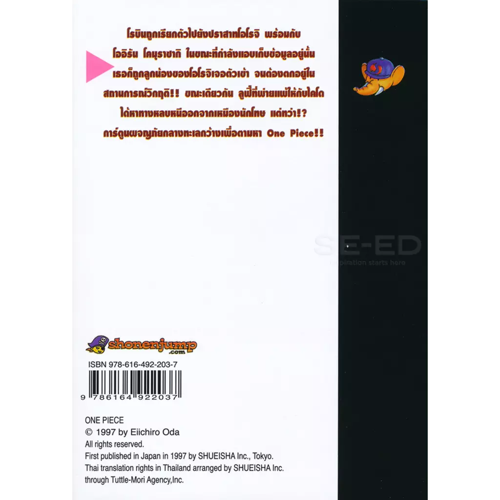 โรบินถูกเรียกตัวไปยังปราสาทโอโรจิ พร้อมกับโออิรัน โคมุราซากิ ในขณะที่กำลังแอบเก็บข้อมูลอยู่นั้น เธอก็ถูกลูกน้องของโอโรจิเจอตัวเข้า…จนต้องตกอยู่ในสถานการณ์วิกฤติ!! ขณะเดียวกัน ลูฟี่ที่พ่ายแพ้ให้กับไคโด ได้หาทางหลบหนีออกจากเหมืองนักโทษ แต่ทว่า!? ผลที่ออกมาจะเป็นเช่นไร? ติดตามพร้อมกันในเล่ม!