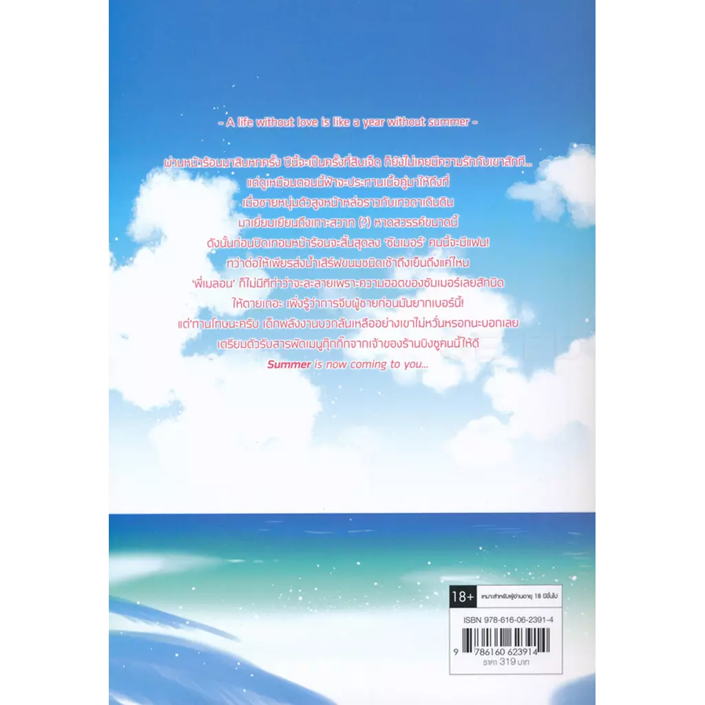 ผ่านหน้าร้อนมาสิบหกครั้ง ปีนี้จะเป็นครั้งที่สิบเจ็ด ก็ยังไม่เคยมีความรักกับเขาสักที.. แต่ดูเหมือนตอนนี้ฟ้าจะประทานเนื้อคู่มาให้ถึงที่ เมื่อชายหนุ่มตัวสูงหน้าหล่อราวกับเทวดาเดินดิน มาเยี่ยมเยียนถึงเกาะสวาท (?) หาดสวรรค์ขนาดนี้ ดังนั้นก่อนปิดเทอมหน้าร้อนจะสิ้นสุดลง “ซัมเมอร์” คนนี้จะมีแฟน! ทว่าต่อให้เพียรส่งน้ำเสิร์ฟขนมชนิดเช้าถึงเย็นถึงแค่ไหน “พี่เมลอน” ก็ไม่มีทีท่าว่าจะละลายเพราะความฮอตของซัมเมอร์เลยสักนิด ให้ตายเถอะ เพิ่งรู้ว่าการจีบผู้ชายก่อนมันยากเบอร์นี้! แต่.. ทานโทษนะครับ เด็กพลังงานบวกล้นเหลืออย่างเขาไม่หวั่นหรอกนะบอกเลย เตรียมตัวรับสารพัดเมนูกุ๊กกิ๊กจากเจ้าของร้านบิงซูคนนี้ให้ดี..