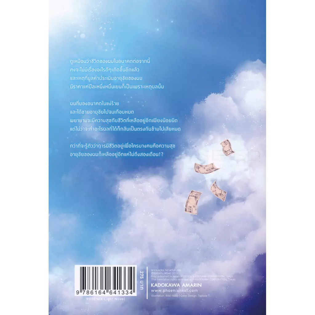 ดูเหมือนว่าชีวิตของผมในอนาคตต่อจากนี้ คงจะไม่มีเรื่องอะไรดี ๆ เกิดขึ้นอีกแล้ว…และเหตุที่มูลค่าประเมินอายุขัยของผม มีราคาแค่ปีละหนึ่งหมื่นเยนก็เป็นเพราะเหตุผลนั้น ผมที่มองอนาคตในแง่ร้าย และได้ขายอายุขัยไปจนเกือบหมด พยายามจะมีความสุขกับชีวิตที่เหลืออยู่อีกเพียงน้อยนิด แต่ไม่ว่าจะทำอะไร ผลที่ได้ก็กลับเป็นตรงกันข้ามไปเสียหมด…กว่าที่จะรู้ตัวว่าการมีชีวิตอยู่เพื่อใครบางคนคือความสุข อายุขัยของผมก็เหลืออยู่อีกแค่ไม่ถึงสองเดือน!? เรื่องราวต้อจากนี้จะเป็นอย่างไร ติดตามพร้อมกันได้แล้วในเล่ม!