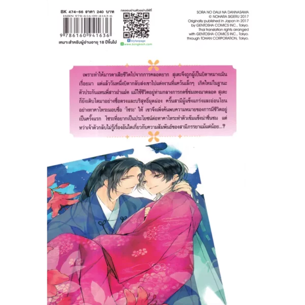 เพราะทำให้มารดาเสียชีวิตไปจากการคลอดยาก “สุเตะ” จึงถูกผู้เป็นบิดาหมางเมินเรื่อยมา แต่แล้ววันหนึ่งบิดากลับส่งเขาไปแต่งงานที่แคว้นเล็กๆ เกิดใหม่ในฐานะตัวประกันแทนพี่สาวฝาแฝด แม้ใช้ชีวิตอยู่ท่ามกลางการกดขี่ข่มเหงมาตลอด สุเตะก็ยังเติบโตมาอย่างซื่อตรงและบริสุทธิ์ผุดผ่อง ครั้นสามีผู้แข็งแกร่งและอ่อนโยนอย่าง “ทาคาโทระ” มอบชื่อ “โซระ” ให้ เขาจึงเพิ่งค้นพบความหมายของการมีชีวิตอยู่เป็นครั้งแรก โซระที่อยากเป็นประโยชน์ต่อทาคาโทระทำตัวเข้มแข็งน่าชื่นชม แต่ทว่าเจ้าตัวกลับไม่รู้เรื่องอันใดเกี่ยวกับความสัมพันธ์ของสามีภรรยาแม้แต่น้อย…?