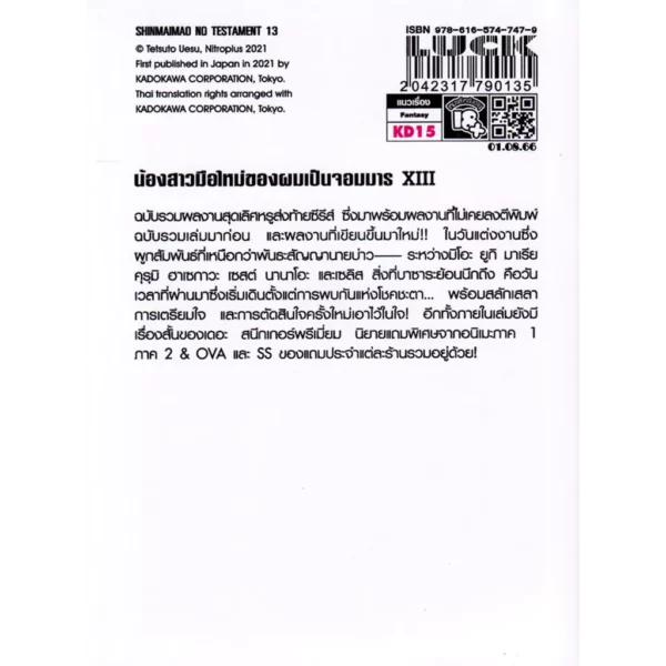 น้องสาวมือไหม่ของผมเป็นจอมมาร XIII ฉบับรวมผลงานสุดเลิศหรูส่งท้ายซีรีส์ ซึ่งมาพร้อมผลงานที่ไม่เคยลงตีพิมพ์ฉบับรวมเล่มมาก่อน และผลงานที่เขียนขึ้นมาใหม่!! ในวันแต่งงานซึ่ง ผูกสัมพันธ์ที่เหนือกว่าพันธะสัญญานายบ่าว ระหว่างมิโอะ ยูกิ มาเรีย คุรุมิ ฮาเซกาวะ เซสต์ นานาโอะ และเซลิส สิ่งที่บาซาระย้อนนึกถึง คือวันเวลาที่ผ่านมาซึ่งเริ่มเดินตั้งแต่การพบกันแห่งโชคชะตา…พร้อมสลักเสลาการเตรียมใจ และการตัดสินใจครั้งใหม่เอาไว้ในใจ! อีกทั้งภายในเล่มยังมีเรื่องสั้นของเดอะ สนีกเกอร์พเมี่ยม นิยายแถมพิเศษจากอนิเมะภาค 1 ภาค 2 OVA และ SS ของแถมประจำแต่ละร้านรวมอยู่ด้วย