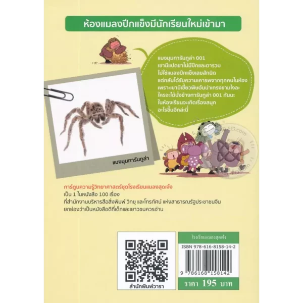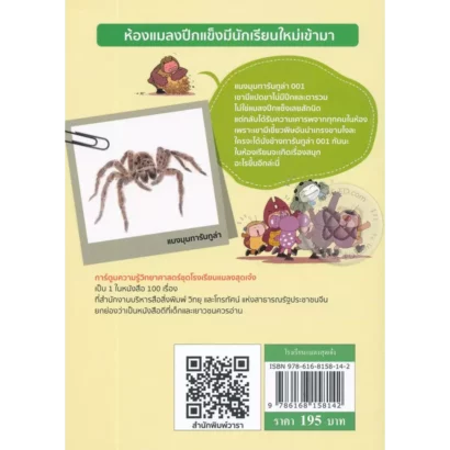 “โรงเรียนแมลงสุดเจ๋ง (ฉบับการ์ตูน)” เล่มนี้จะพาเด็ก ๆ ไปรู้จักกับ “แมงมุมทารันทูล่า 001” เขามีแปดขา ไม่มีปีกและตารวม ไม่ใช่แมลงปีกแข็งเลยสักนิด แต่กลับได้รับความเคารพจากทุกคนในห้อง เพราะเขามีเขี้ยวพิษอันน่าเกรงขามไงล่ะ ใครจะได้นั่งข้าง “ทารันทูล่า 001” กันนะ? ในห้องเรียนจะเกิดเรื่องสนุกอะไรขึ้นอีกล่ะนี่..