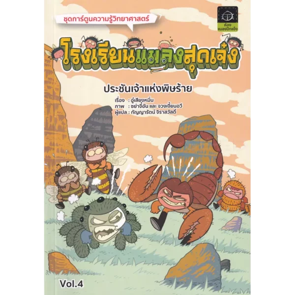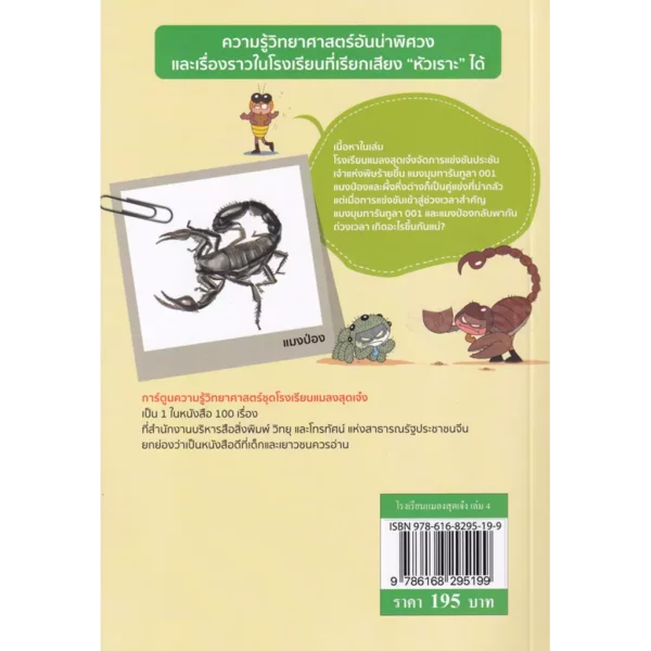 “โรงเรียนแมลงสุดเจ๋ง เล่ม 4 (ฉบับการ์ตูน)” เล่มนี้ จะพาเด็ก ๆ ไปพบกับเรื่องราวของโรงเรียนแมลงสุดเจ๋ง จัดการแข่งขันประชันเจ้าแห่งพิษร้ายขึ้น ” แมงมุมทารันทูล่า 001 ” แมงป่องและผึ้งหึ่งต่างก็เป็นคู่แข่งขันที่น่ากลัว แต่เมื่อการแข่งขันเข้าสู่ช่วงเวลสำคัญ “แมงมุมทารัยทูล่า 001” และแมงป่องกลับพากันถ่วงเวลา เกิดอะไรขึ้นกันแน่! ติดตามพร้อมกันได้แล้วในเล่ม!