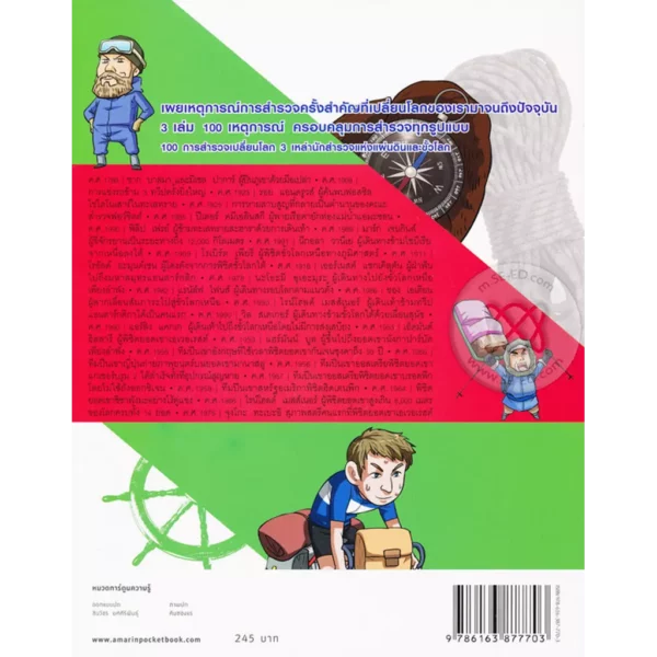 หนังสือ “100 การสำรวจเปลี่ยนโลก” เล่มนี้ เป็นหนึ่งในหนังสือ “ชุด 100 เหตุการณ์สำคัญ” รวมรวบเหตุการณ์สำคัญในประวัติศาสตร์การสำรวจ ไล่ไปตามปีที่เกิดเหตุการณ์ ซึ่งจะทำให้เด็กๆ ได้ความรู้อันหลากหลายเกี่ยวกับการสำรวจและได้อ่านเรื่องราวการสำรวจที่สนุกสนาน ทั้งโจรสลัดที่ค้นพบอเมริกา บรรดานักสำรวจผู้เสียสละเพื่อค้นหาเส้นทางเดินเรือ ได้รู้จักนักสำรวจที่น่ายกย่อง และได้เห็นความสำคัญของการสำรวจที่ยังประโยชน์จนถึงปัจจุบัน