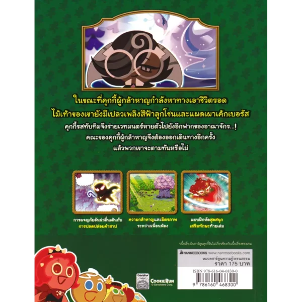 ในขณะที่ “คุกกี้ผู้กล้าหาญ” กำลังหาทางเอาชีวิตรอด ไม้เท้าของเขายังมีเปลวเพลิงสีฟ้าลุกโชนและแผดเผาเค้กเบอรัส “คุกกี้รสทับทิม” จึงร่ายเวทมนตร์หายตัวไปยังอีกฟากของอาณาจักร..! คณะของคุกกี้ผู้กล้าหาญจึงต้องออกเดินทางอีกครั้ง แล้วพวกเขาจะตามทันหรือไม่…การผจญภัยอันน่าตื่นเต้นกับการปลดปล่อยคำสาป ความกล้าหาญและมิตรภาพ ระหว่างเพื่อนพ้อง แบบฝึกหัดสุดสนุก เสริมทักษะท้ายเล่ม!