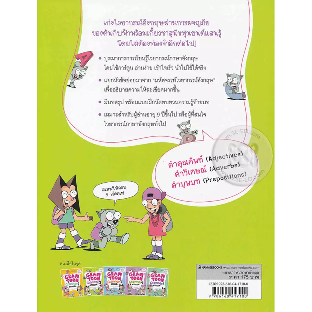 เก่งไวยากรณ์อังกฤษผ่านการผจญภัยของ “ต้น” กับ “ฟ้า” พร้อม “เกี๊ยวซ่า” สุนัขหุ่นยนต์แสนรู้ โดยไม่ต้องท่องจำอีกต่อไป! หนังสือเล่มนี้ได้รวมเนื้อหาไวยากรณ์ขั้นพื้นฐานเรื่อง คำคุณศัพท์ (Adjectices) คำวิเศษณ์ (Adverbs) และคำบุพบท (Preposition) โดยอธิบายหลักการใช้แบบเข้าใจง่าย ใช้ได้เร็ว พร้อมสรุปเนื้อหาและแบบฝึกหัดท้ายบทช่วยทบทวนความเข้าใจอย่างครบถ้วน เหมาะสำหรับเด็กที่เริ่มเรียนภาษาอังกฤษ ไปจนถึงผู้ใหญ่ที่ต้องการทบทวนไวยากรณ์ภาษาอังกฤษ รับรองได้ว่าคุณผู้อ่านจะสนุกสนานไปกับการเรียนรู้จนวางไม่ลงเลยทีเดียว!